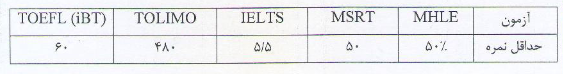 ۵-۱-۳- برای اعزام به فرصت تحقیقاتی در کشورهای انگلیسی زبان ارائه گواهی معتبر زبان انگلیسی و کسب حداقل نمره مطابق جدول زیر در یکی از آزمونهای TOEFL iBT ،TOLIMO ،IELTS ،MSRT، (صرفاً برای دانشجویان گروه پزشکی) MHLE از سوی دانشجو الزامی است. برای اعزام به فرصت تحقیقاتی کشورهای غیر انگلیسی زبان ارائه گواهی معتبر زبان انگلیسی و کسب حداقل نمره مطابق جدول زیر یا ارائه گواهی معتبر مبنی بر تسلط به زبان رسمی آن کشور یا برگزاری آزمون (اعم از شفاهی یا کتبی) و احراز بسندگی زبان آن کشور توسط اداره کل الزامی است.