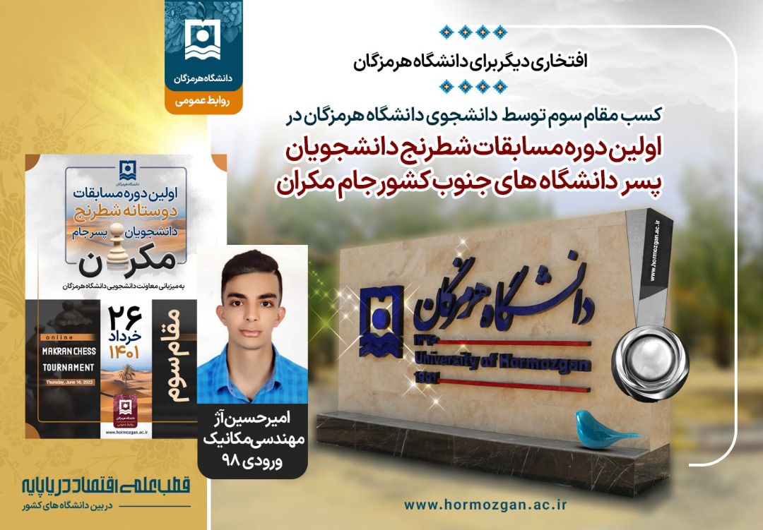 افتخاری دیگر برای دانشگاه هرمزگان در اولین دوره مسابقات شطرنج دانشجویان پسر دانشگاه‌های جنوب کشور جام مکران به میزبانی دانشگاه هرمزگان