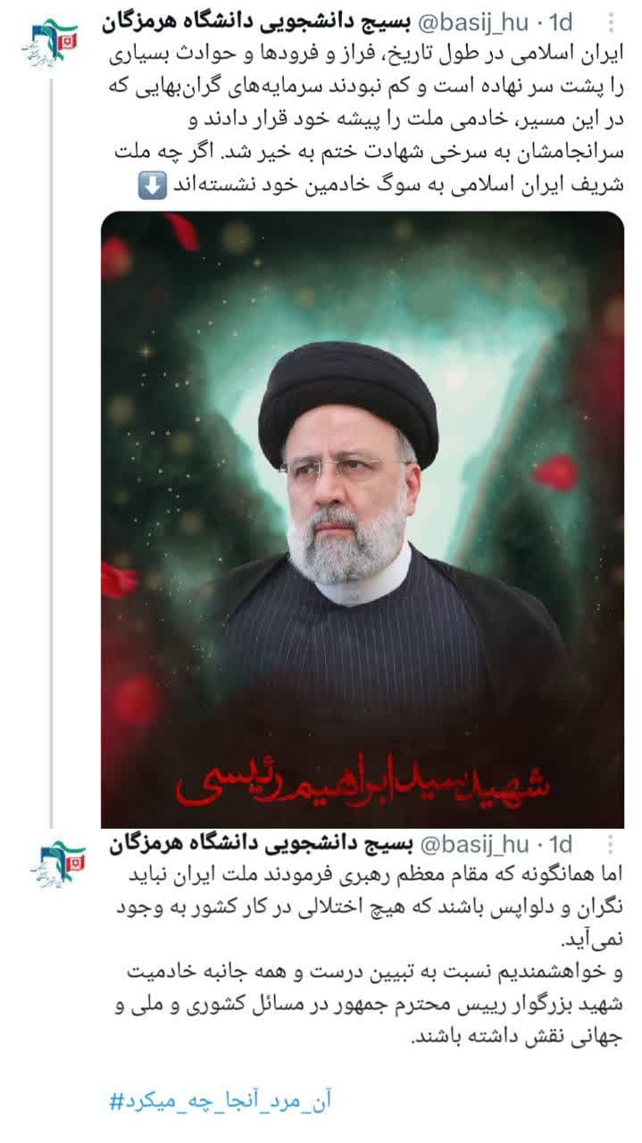 توییت بسیج دانشجویی دانشگاه هرمزگان در پی سانحه سقوط بالگرد و شهادت آیت‌الله رئیسی