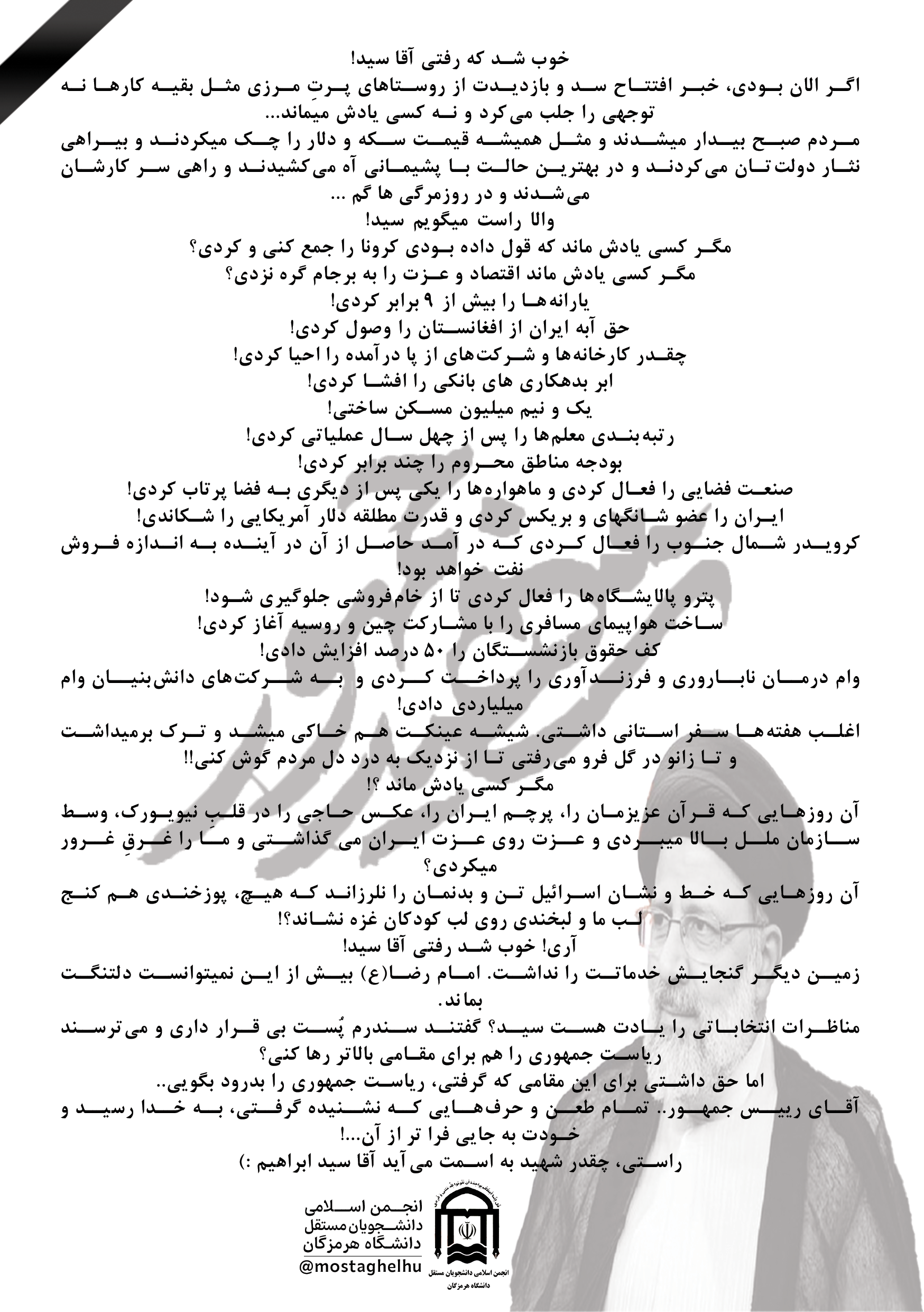 بیانیه انجمن اسلامی دانشجویان مستقل دانشگاه هرمزگان در پی شهادت رئیس جمهور و همراهان