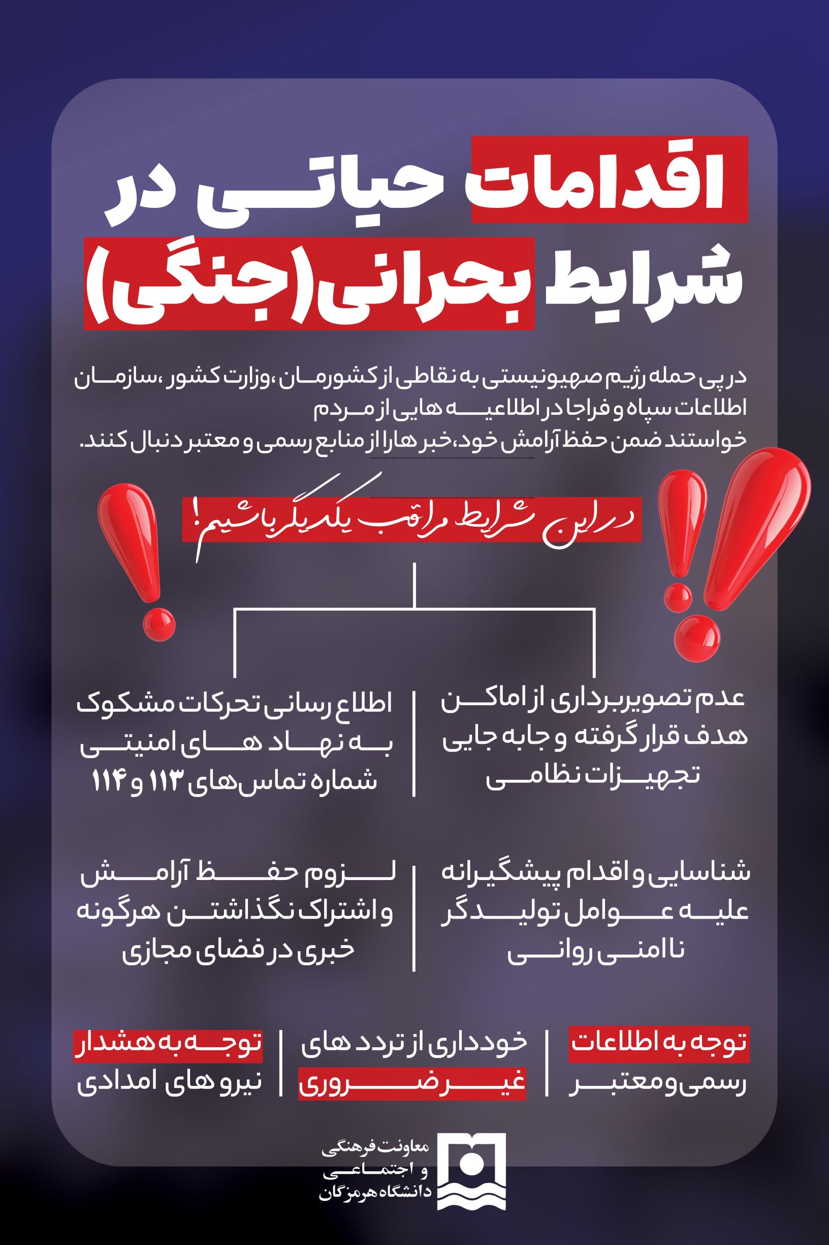 بیانیه معاونت فرهنگی و اجتماعی دانشگاه هرمزگان در محکومیت حمله رژیم صهیونیستی به خاک جمهوری اسلامی ایران