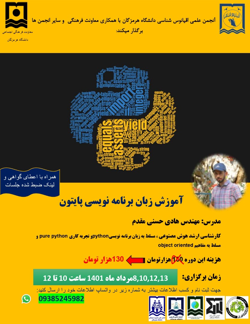 انجمن علمی اقیانوس شناسی دانشگاه هرمزگان با همکاری معاونت فرهنگی و سایر انجمن‌ها برگزار می‌کند: دوره آموزش زبان برنامه نویسی پایتون