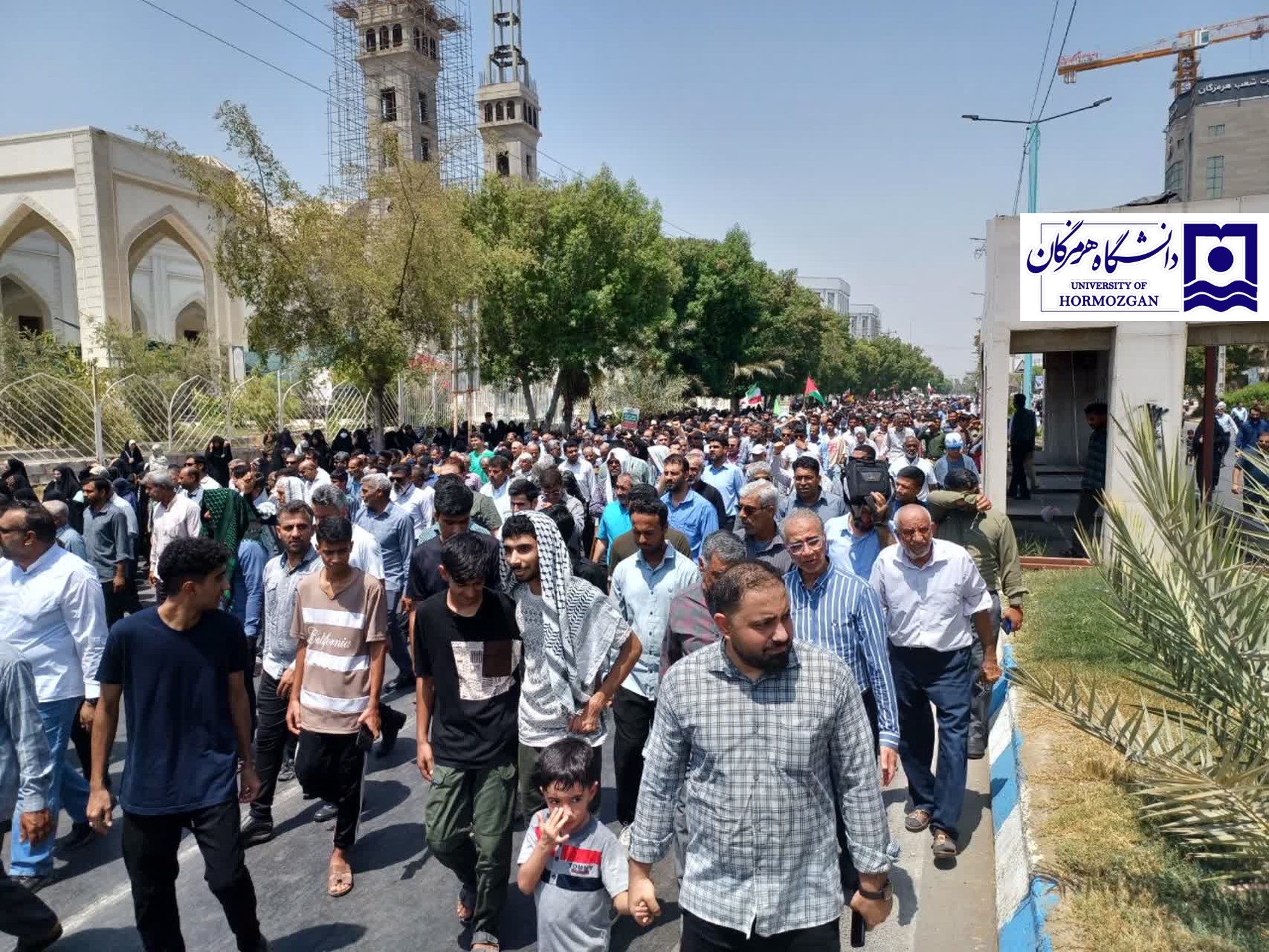 معاونت فرهنگی و اجتماعی دانشگاه هرمزگان در واکنش به این رخداد خونین، طی فراخوانی از خانواده بزرگ دانشگاه، شامل دانشجویان، اساتید و کارکنان، جهت حضور گسترده در راهپیمایی «جمعه خشم و نصر» دعوت به عمل آورد. این مراسم در روز جمعه ۳۰ خرداد در شهر بندرعباس و در گرمای طاقتفرسای جنوبی برگزار شد؛ اما این شرایط دشوار، مانعی برای خروش پرصلابت دانشگاهیان و مردم غیور بندرعباس نبود.
