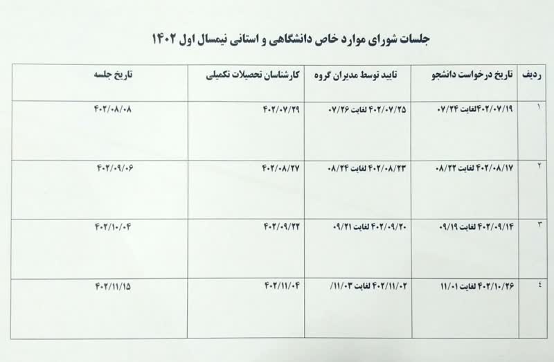 جدول جلسات شورای موارد خاص نیمسال اول 1402