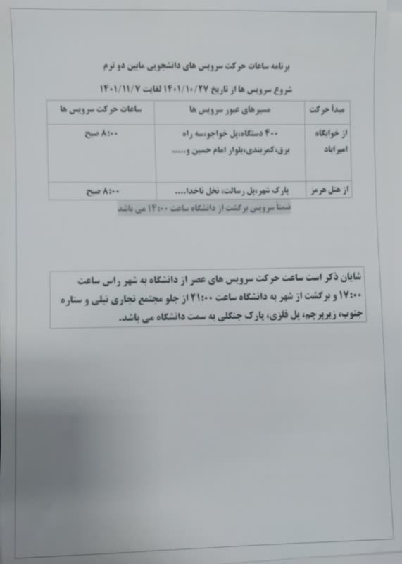 ساعات حرکت سرویس های دانشجویی مابین دو نیمسال