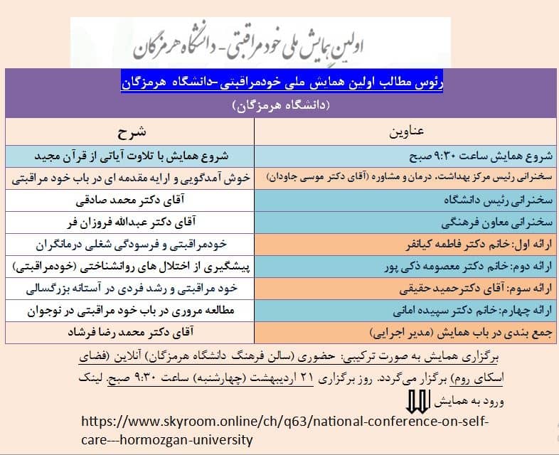نخستین همایش خود مراقبتی دانشگاه هرمزگان زمان چهارشنبه 21 اردیبهشت ماه مکان سالن فرهنگ ساعت 9:30