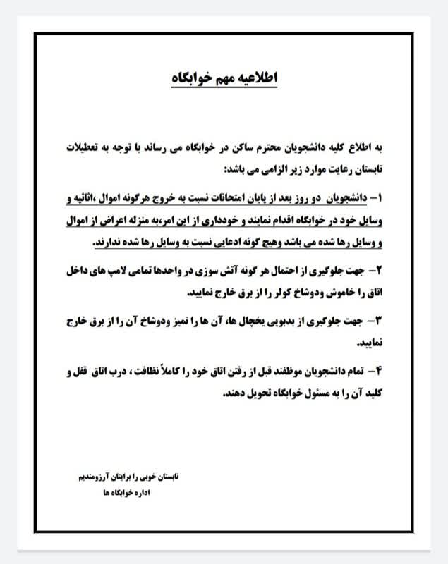 اطلاعیه تعطیلی و تخلیه خوابگاه ها