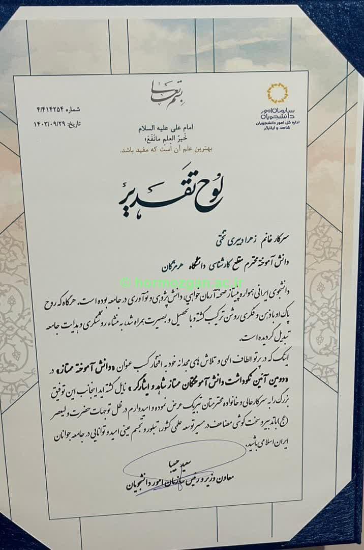 در دومین نکوداشت دانشجویان ممتاز شاهد و ایثارگر سراسر کشور از سرکار خانم زهرا دبیری تختی دانش آموخته ممتاز شاهد و ایثارگر دانشگاه هرمزگان تقدیر به عمل آمد.