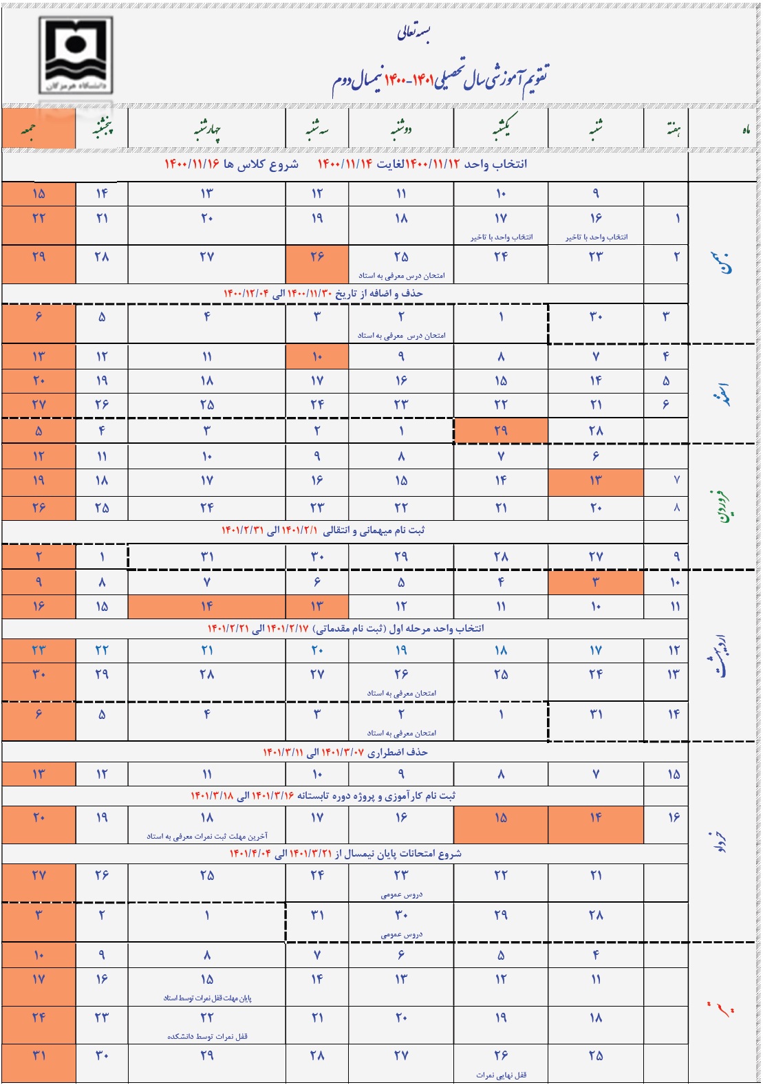 تقویم آموزشی نیمسال دوم 1401 - 1400