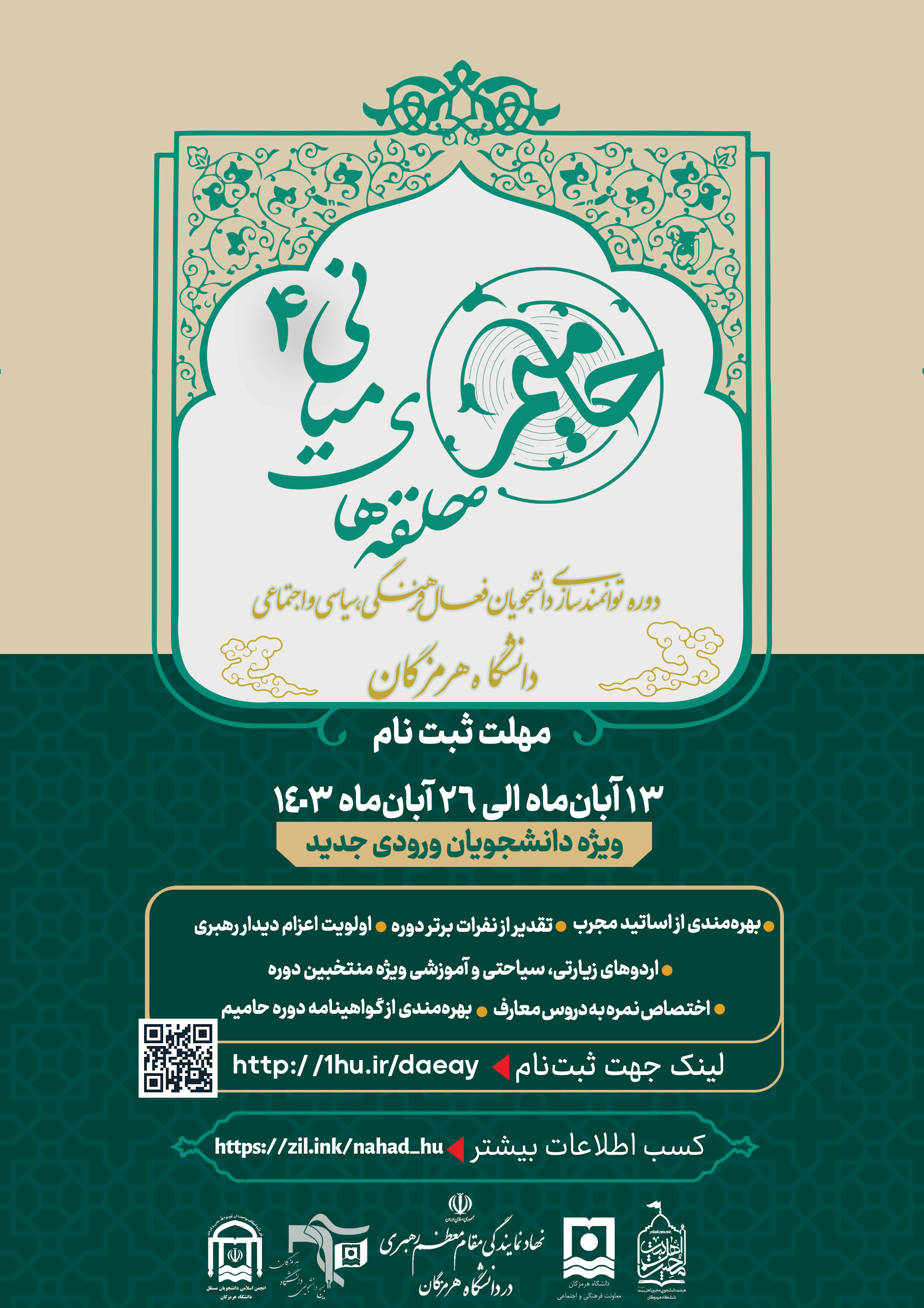 جهت ثبت نام چهارمین دوره توانمند سازی دانشجویان فعال فرهنگی،سیاسی و اجتماعی دانشجویان دانشگاه هرمزگان (حامیم4) با حضور اساتید کشوری و استانی ومحوریت رشد فردی، مهارت اجتماعی و... از (اینجا) اقدام فرمایید.