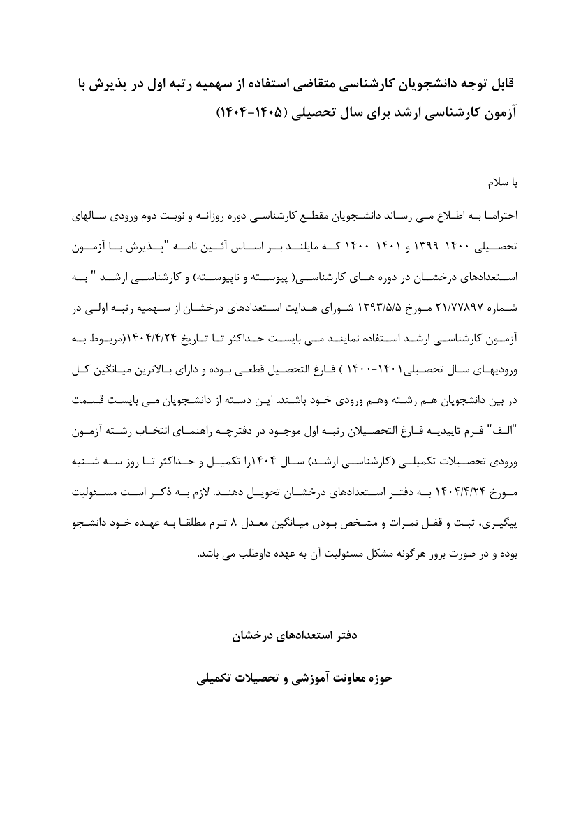 قابل توجه دانشجویان کارشناسی متقاضی استفاده از سهمیه رتبه اول در پذیرش با آزمون کارشناسی ارشد برای سال تحصیلی (1405-1404)