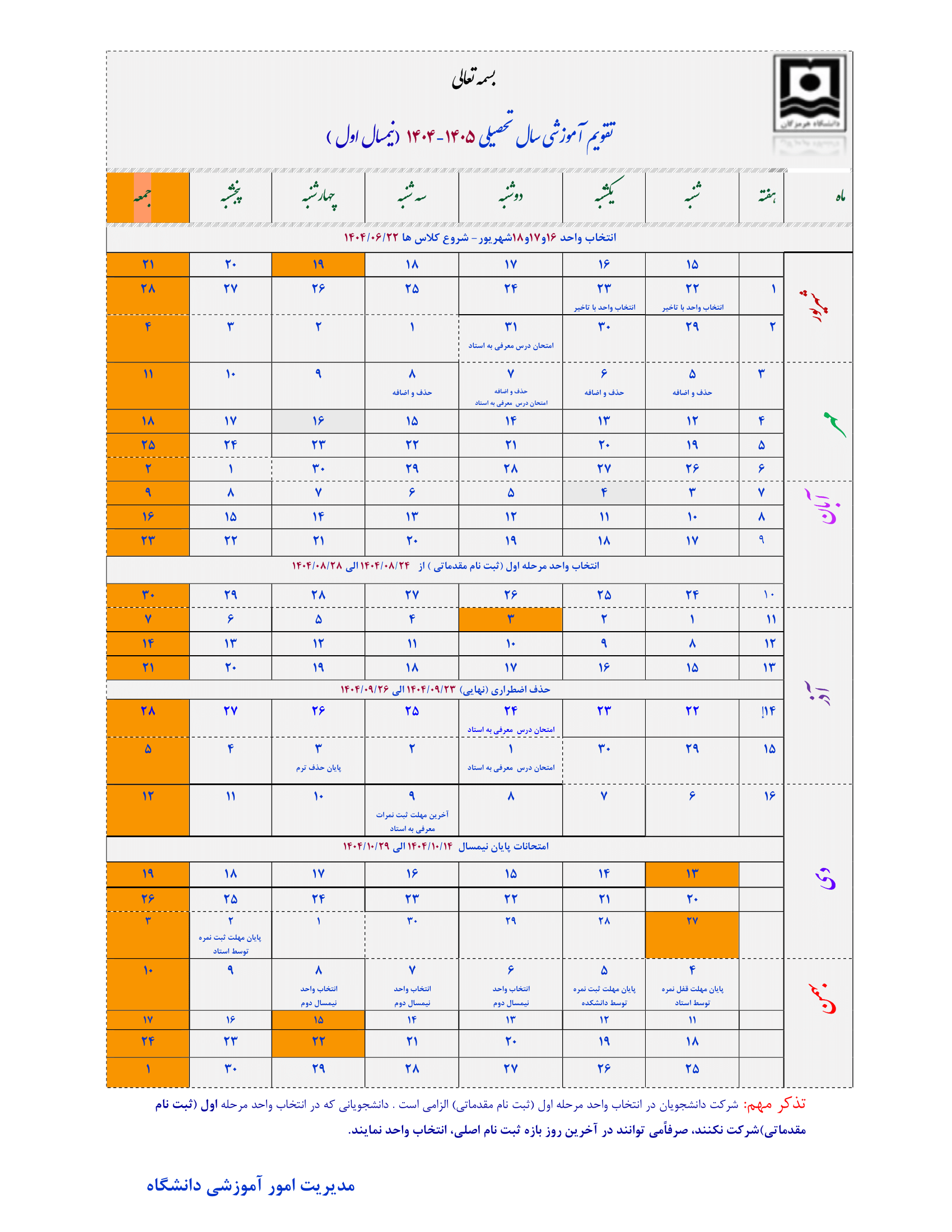 تقویم آموزشی سال تحصیلی 1405-1404 (نیمسال اول )
