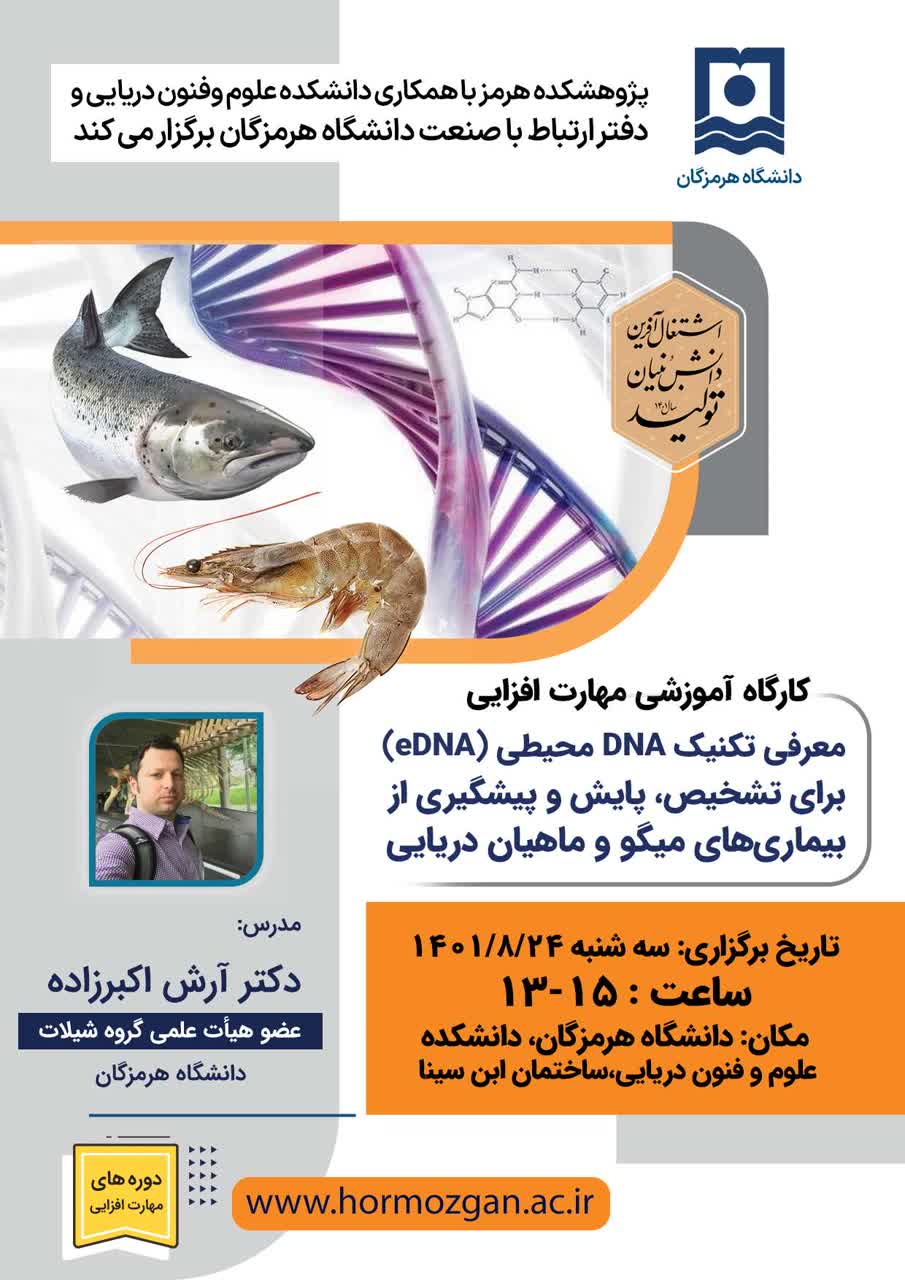 برگزاری کارگاه آموزشی مهارت افزایی/ معرفی تکنیک DNA محیطی (eDNA) برای تشخیص، پایش و پیشگیری از بیماریهای میگو و ماهیان دریایی