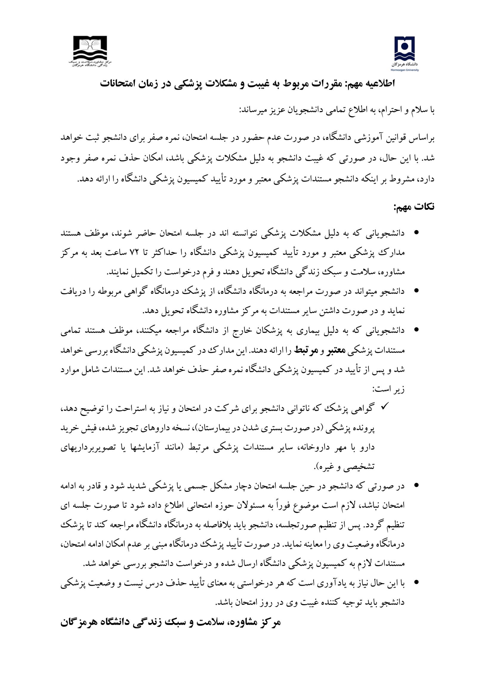 اطلاعیه تحویل مدارک پزشکی غیبت در امتحانات