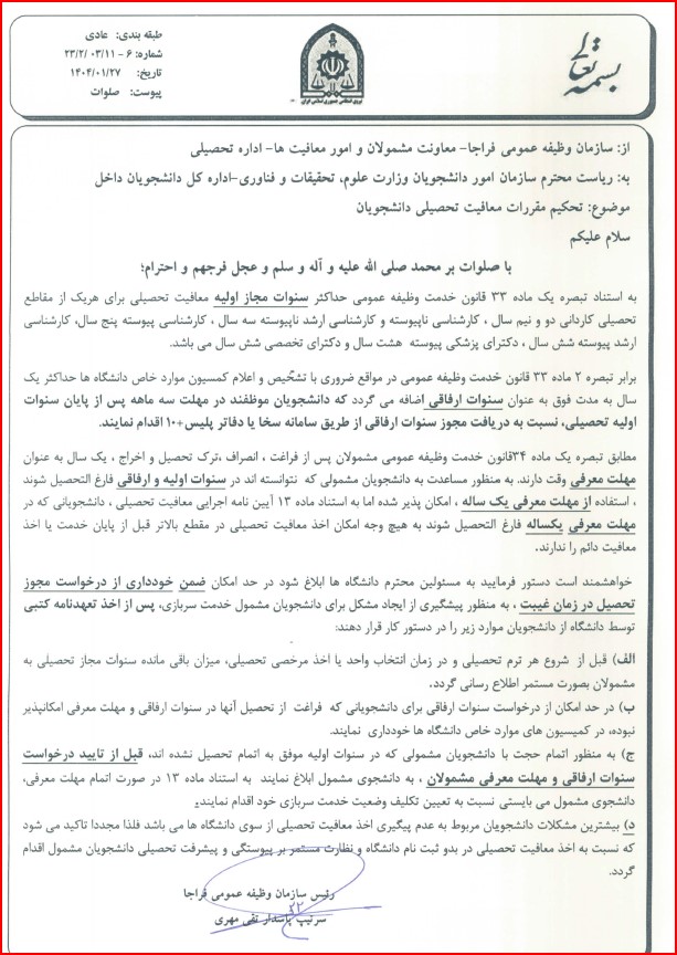 قوانین و مقررات تحکیم معافیت تحصیلی نظام وظیفه دانشجویان