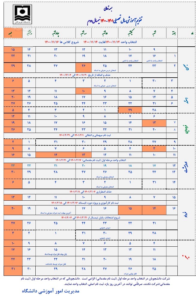 تقویم اموزشی نیمسال دوم 1401-1400