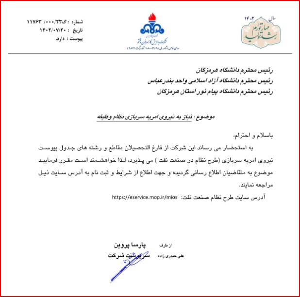 فراخوان امریه سربازی در شرکت گاز سرخون