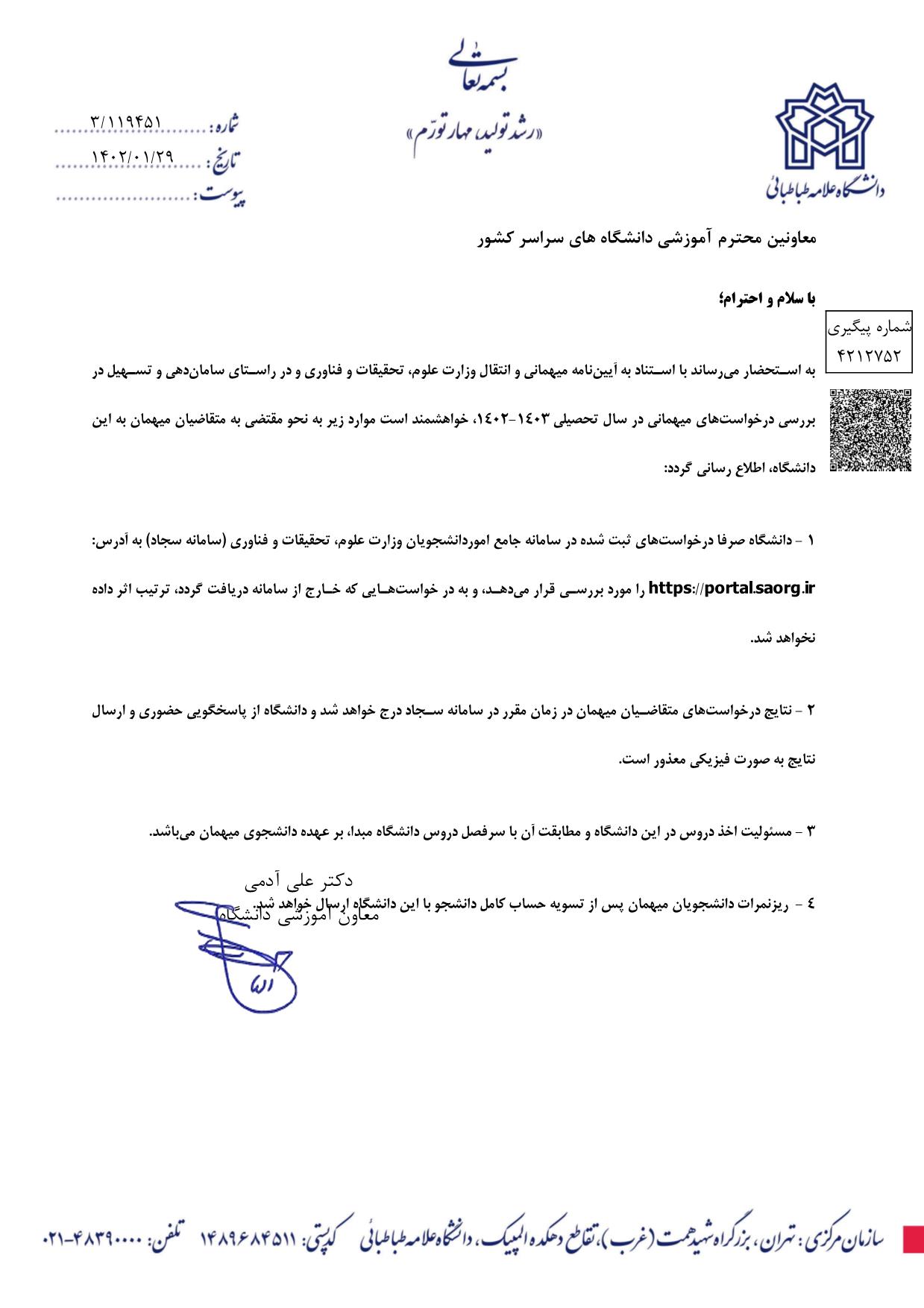 اطلاعیه نحوه پذیرش دانشجوی مهمان