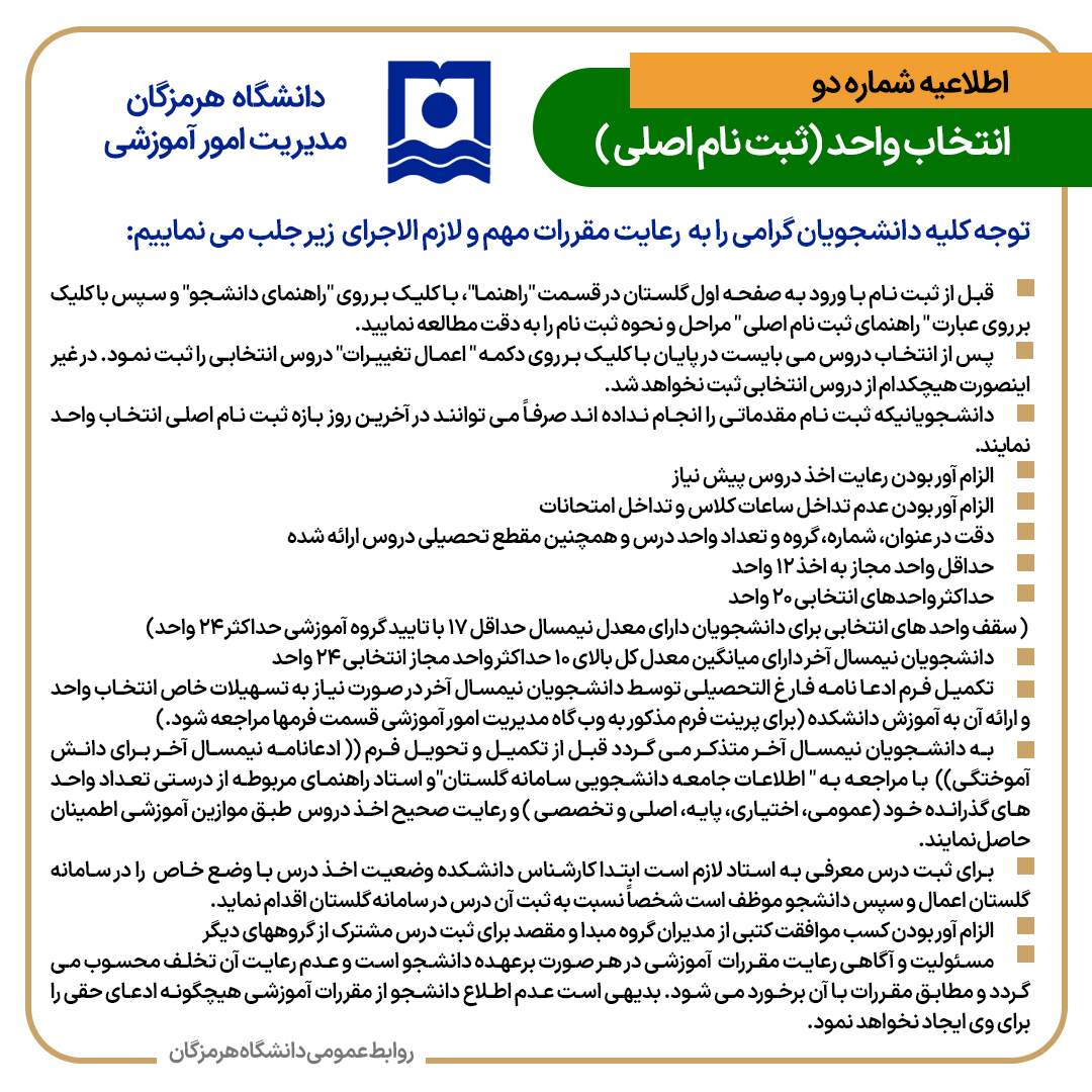 اطلاعیه شماره دو و مقررات انتخاب واحد در نیمسال اول 1402-1401