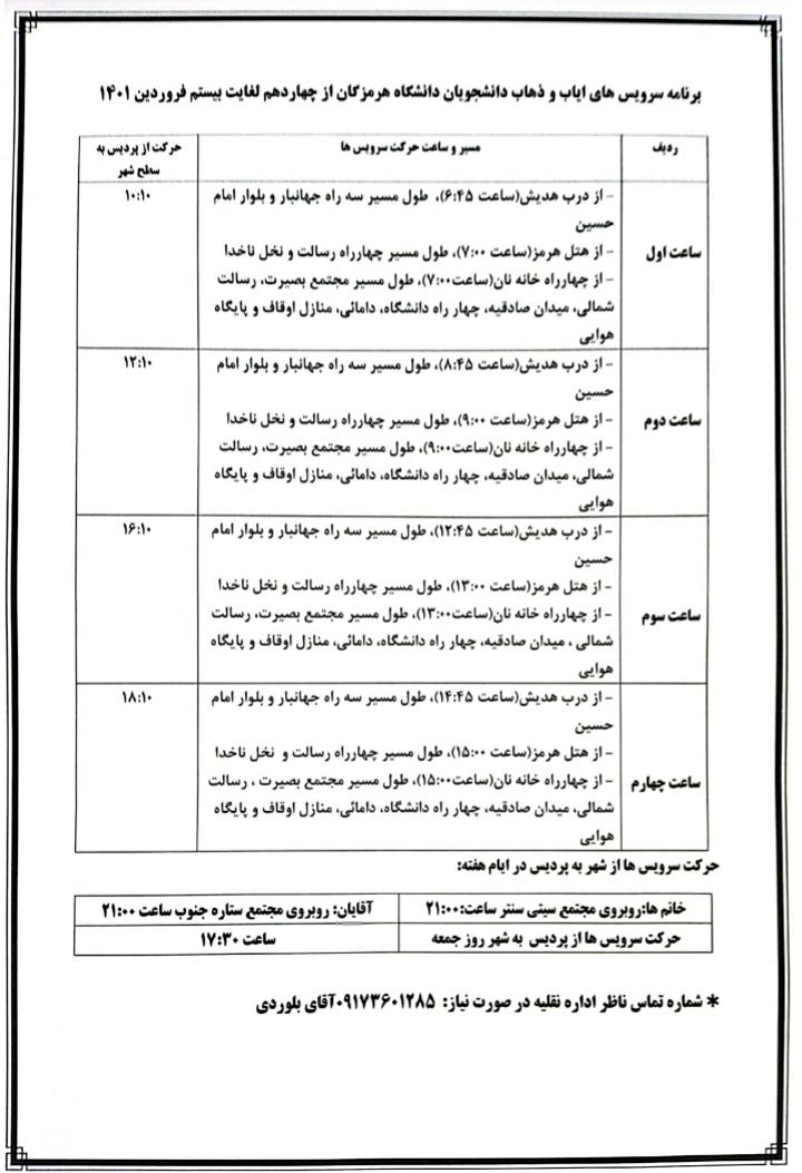 برنامه سرویس های ایاب و ذهاب دانشجویان دانشگاه هرمزگان از چهاردهم فروردین ماه