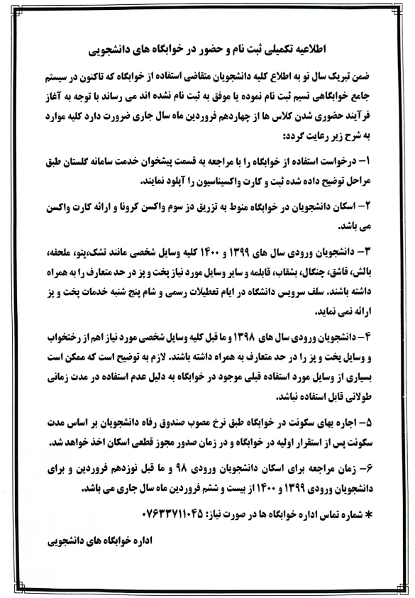 اطلاعیه تکمیلی ثبت نام و نحوه حضور در خوابگاه های دانشجویی