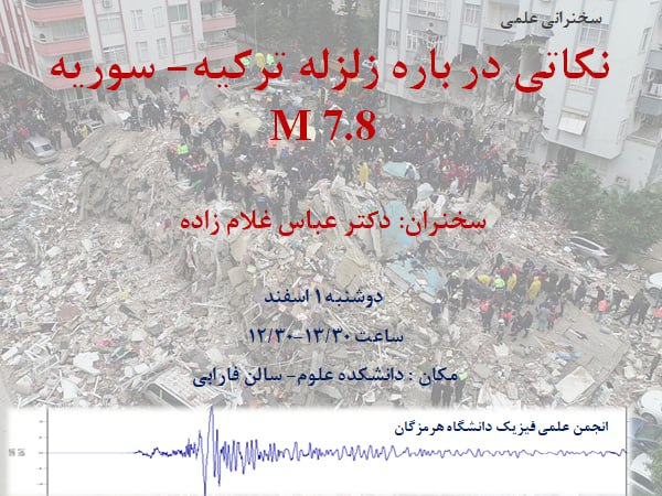 سخنرانی علمی در خصوص نکاتی از زلزله ی ترکیه و سوریه دوشنبه 1 اسفند