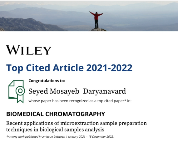 مقاله دکتر سید مصیب دریانورد عضو هیات علمی دانشکده علوم پایه درمیانِ پراستنادترین مقالات مجله بینالمللی Biochemical Chromatography