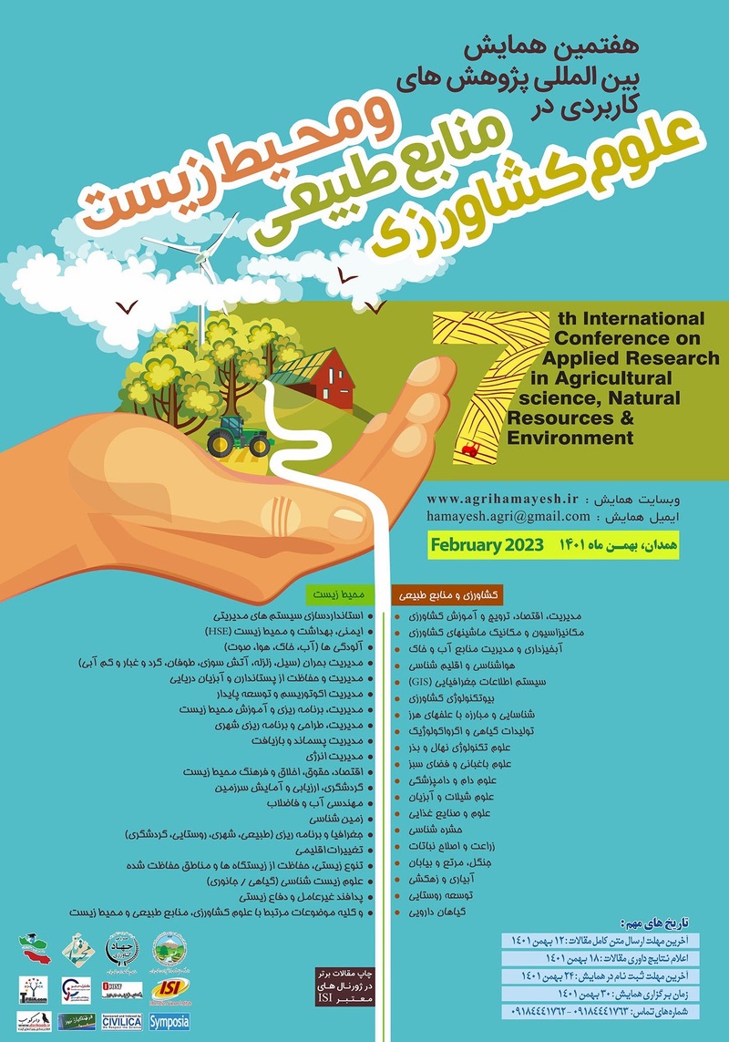 هفتمین همایش بین المللی پژوهش های کاربردی در علوم کشاورزی، منابع طبیعی و محیط زیست در تاریخ ۳۰ بهمن ۱۴۰۱ توسط ،دبیرخانه دائمی همایش در شهر همدان برگزار خواهد شد.با توجه به اینکه این همایش به صورت رسمی برگزار می گردد، کلیه مقالات این کنفرانس در پایگاه سیویلیکا و نیز کنسرسیوم محتوای ملی نمایه خواهد شد و شما می توانید با اطمینان کامل، مقالات خود را در این همایش ارائه نموده و از امتیازات علمی ارائه مقاله کنفرانس با دریافت گواهی کنفرانس استفاده نمایید.