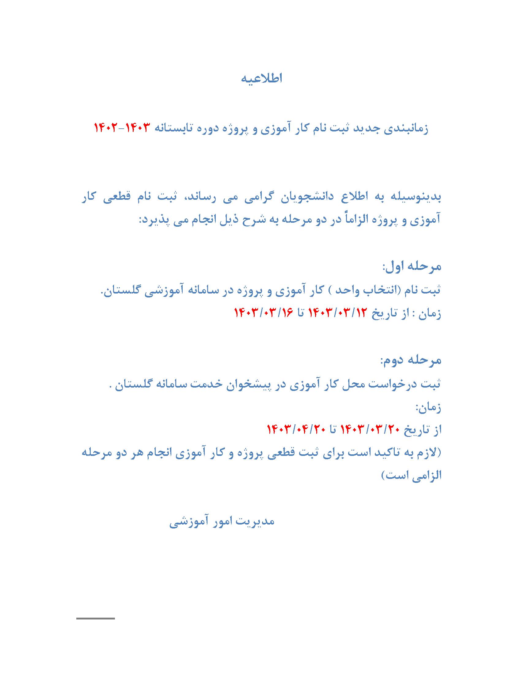 جدول زمانبندی ثبت نام کار آموزی و پروژه دوره تابستانه 1403-1402