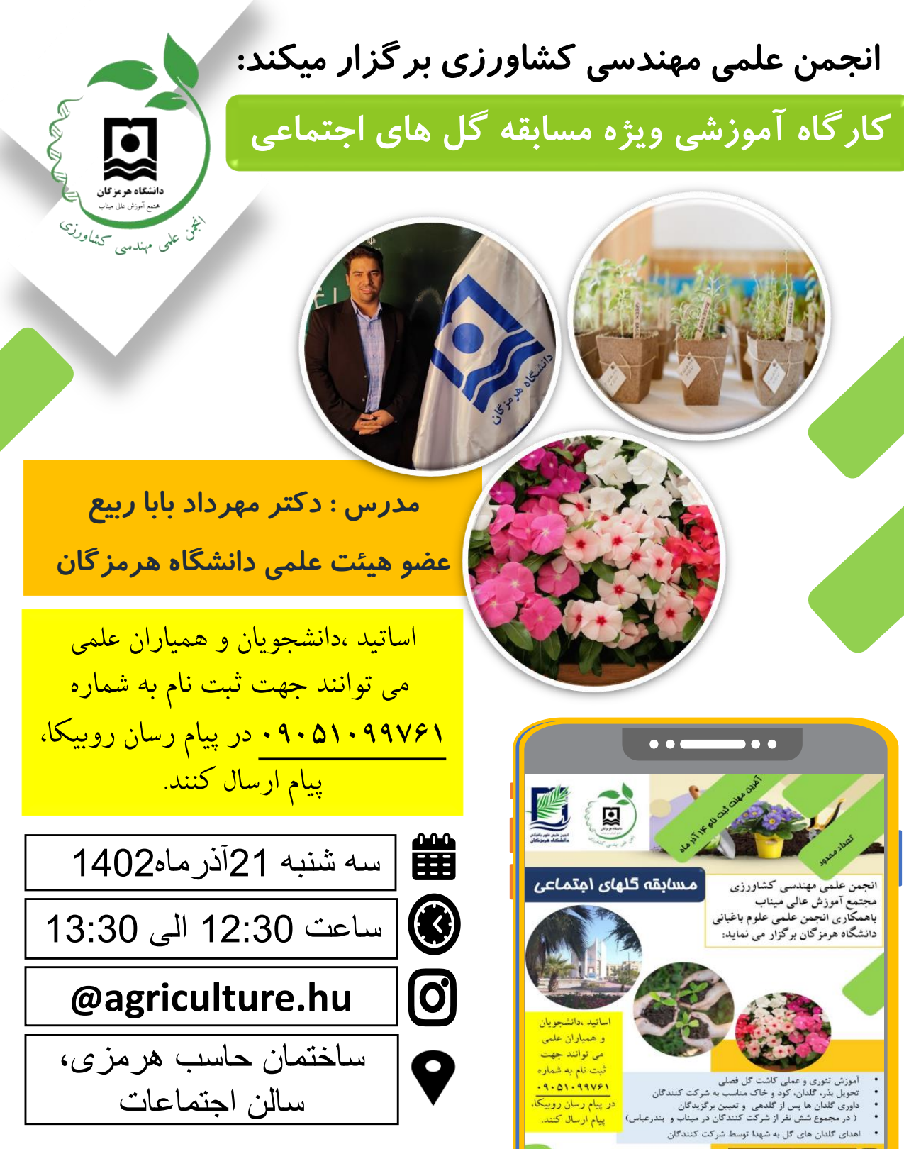 انجمن علمی مهندسی کشاورزی مجتمع آموزش عالی میناب با همکاری انجمن علمی علوم باغبانی دانشگاه هرمزگان برگزار می نماید: